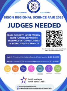 We are looking for judges for this year’ Fairs, firstly it is Holy Cross School Annual Science Fair which will be held on Wednesday March 25h, 2026, and Bison Regional Science Fair will be on Wednesday, April 8th, 2026 for Grade 4-12. We would appreciate it if you could make it! There is an option to do both full days and half days.